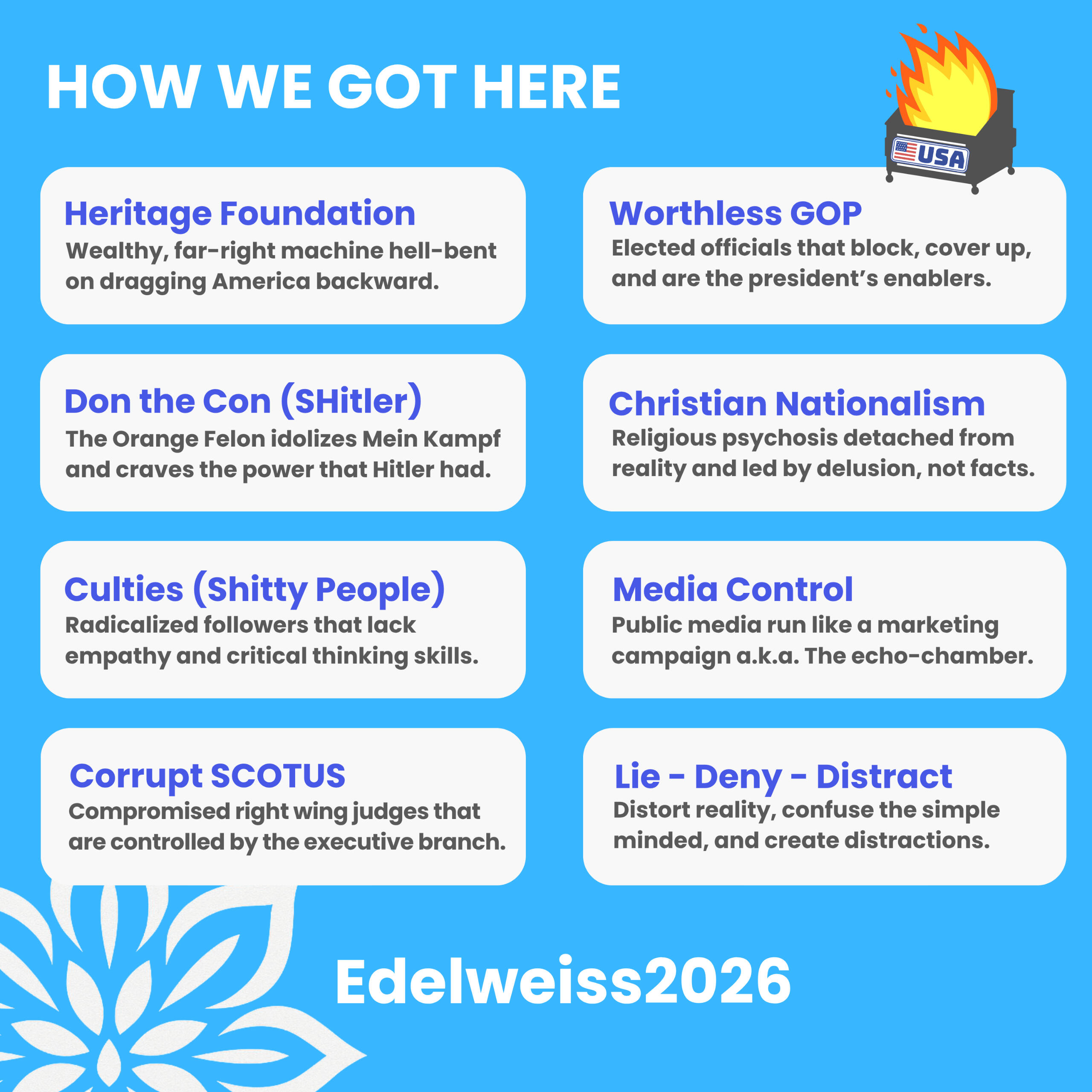 In a country bending toward authoritarian control, the EDELWEISS flower stands as a defiant symbol rooted in RESISTANCE, it opposes fascism, religious extremism and the ugliness of racism + bigotry + misogyny.We have ONE YEAR UNTIL MIDTERMS which may be our last chance to affect the horrific direction our country is heading.